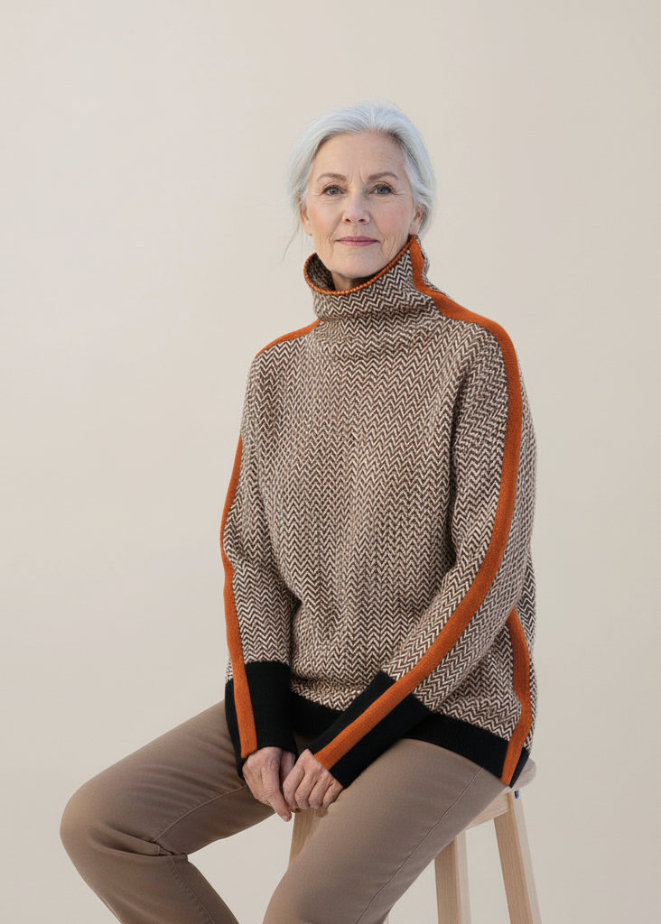Martina-genseren kombinerer moderne eleganse med praktisk komfort – det perfekte plagget for kjølige dager. De kontrasterende stripene gir den et markant og moderne design, mens den høye kragen ikke bare ser stilfull ut, men også holder deg varm. Laget av mykt og hudvennlig materiale er denne genseren ideell for avslappede fritidsøyeblikk eller en casual-chic hverdagslook.